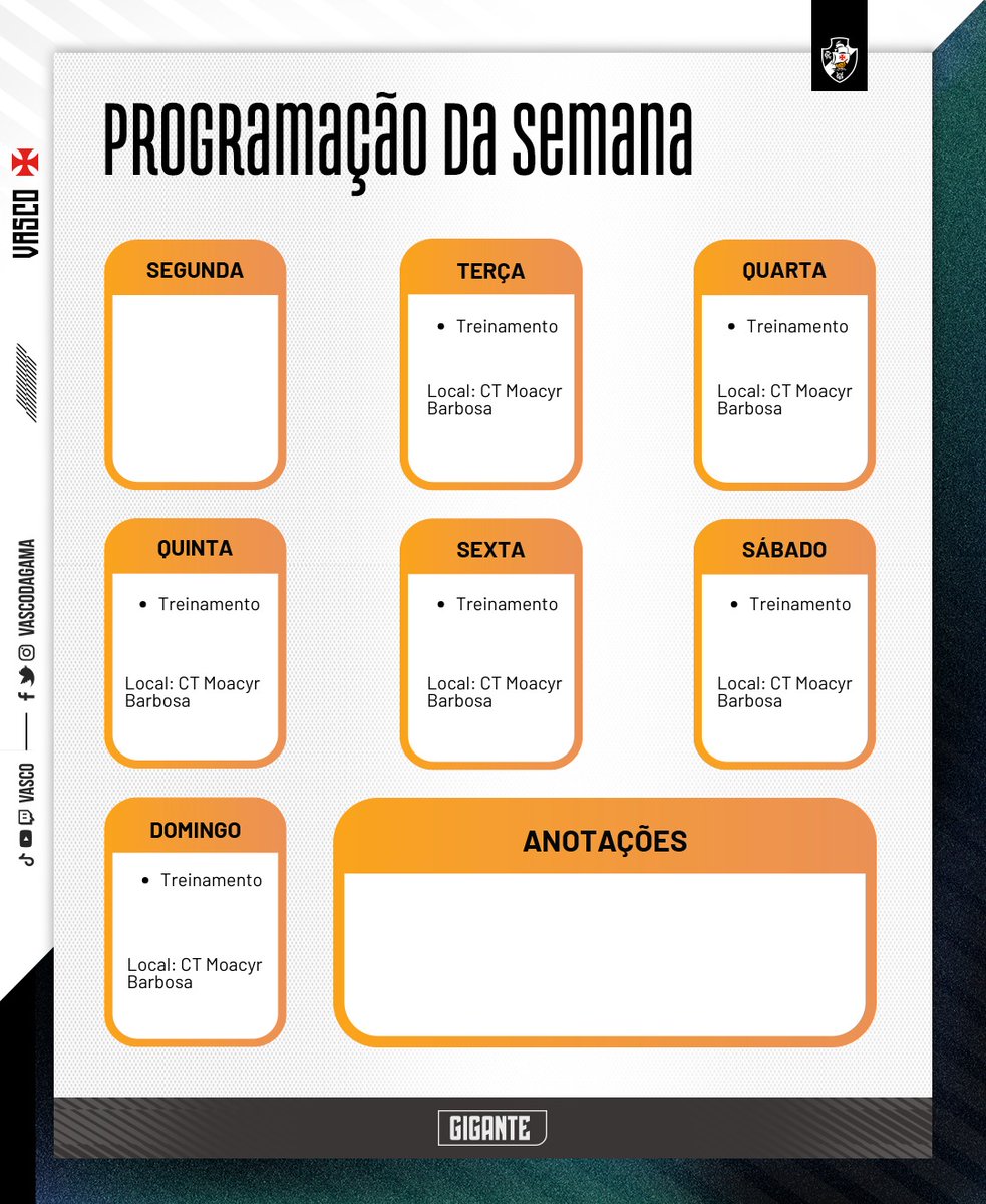PROGRAMAÇÃO DO VASCO PARA A SEMANA