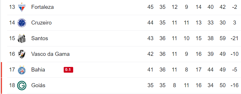 Nesse cenário, o Vasco chegaria a 45 pontos e o Bahia ficaria com 41 pontos: uma diferença de 4 pontos faltando uma rodada do fim do campeonato.