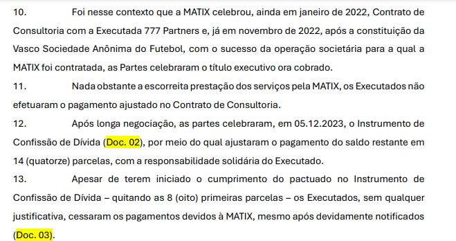 Argumenta que celebrou contrato de consultoria com a 777 Partners para a constituição da SAF e, com o sucesso da operação, assinou com o Vasco SAF a forma de pagamento pelo serviço prestado.