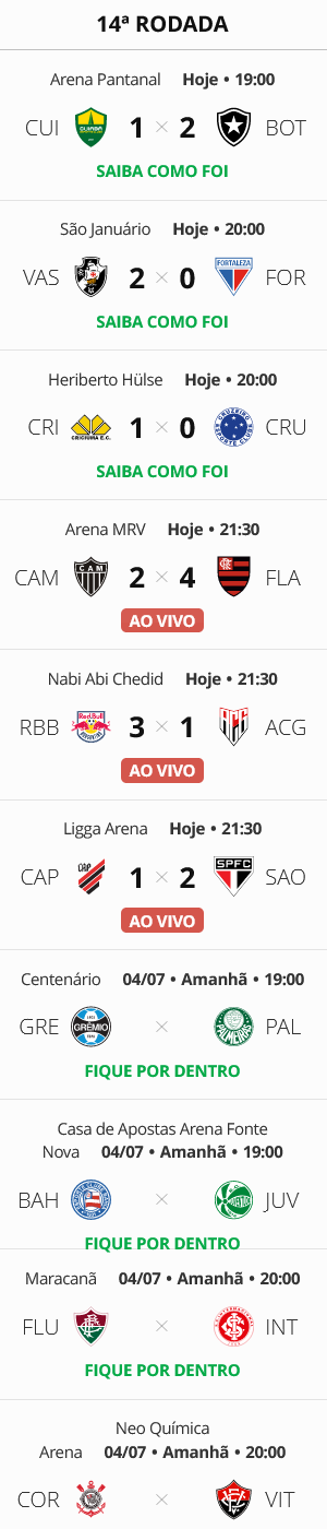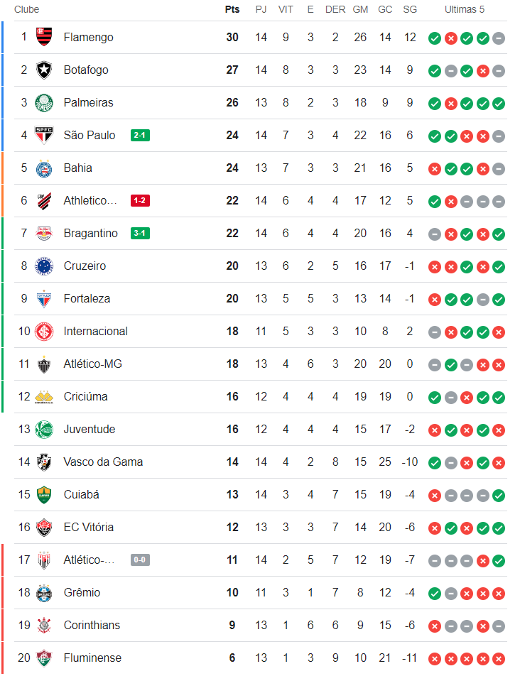 Terminados os jogos de 4ª-feira da 14ª rodada do Campeonato Brasileiro, o Vasco, que derrotou o Fortaleza por 2 a 0, está na 14ª colocação e só pode ser ultrapassado na rodada pelo Vitória, que, para isso, precisa vencer o Corinthians nesta 5ª-feira. O Gigante da Colina não tem nenhuma chance de terminar a 14ª rodada no Z4.