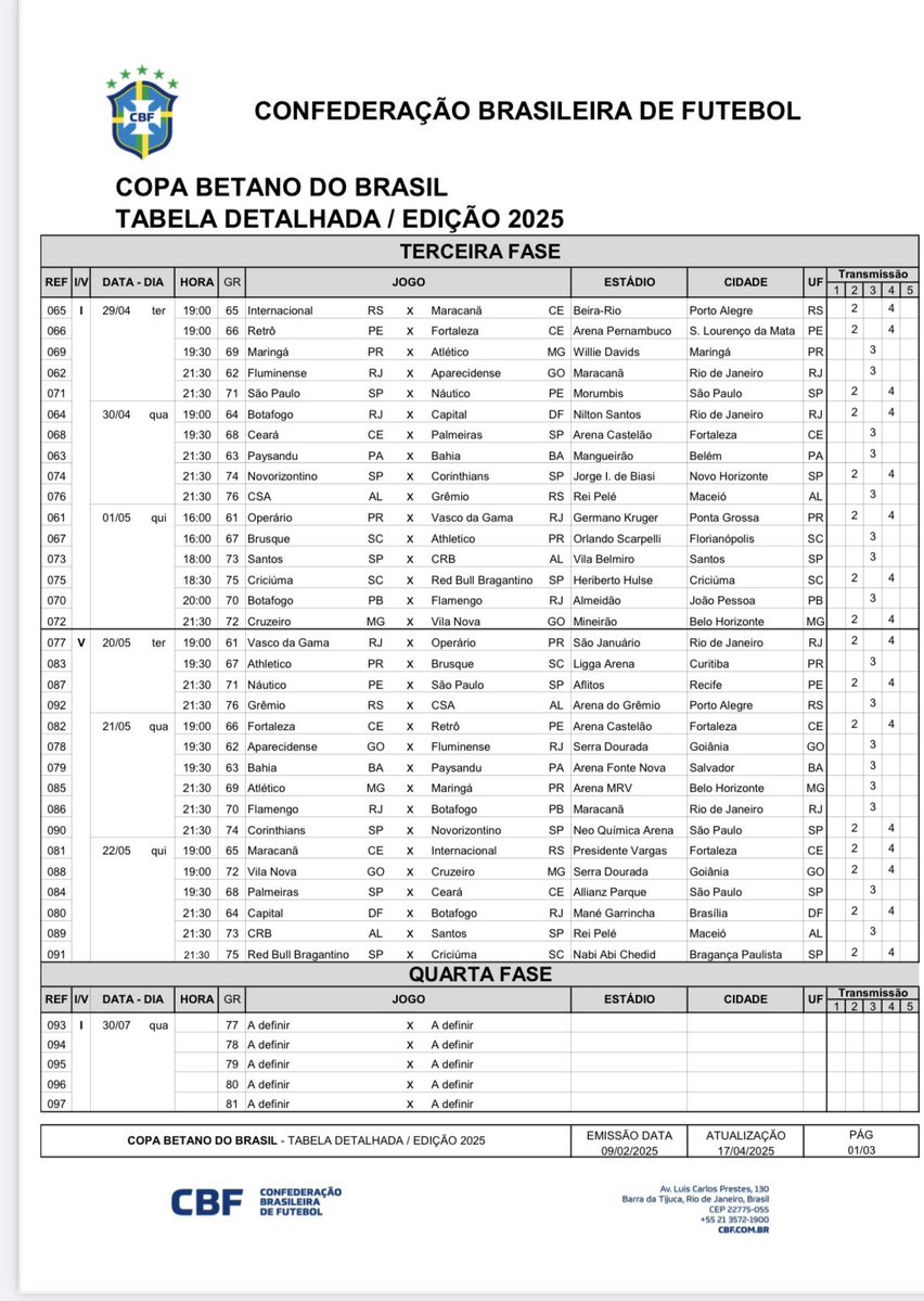 A CBF divulgou a tabela detalhada da terceira fase da Copa do Brasil nesta quinta-feira à tarde. As partidas de ida serão disputadas nos dias 29 e 30 de abril, além de 1º de maio. Os jogos de volta serão realizados entre os dias 20 e 22 de maio (confira lista detalhada com horários e estádios abaixo).